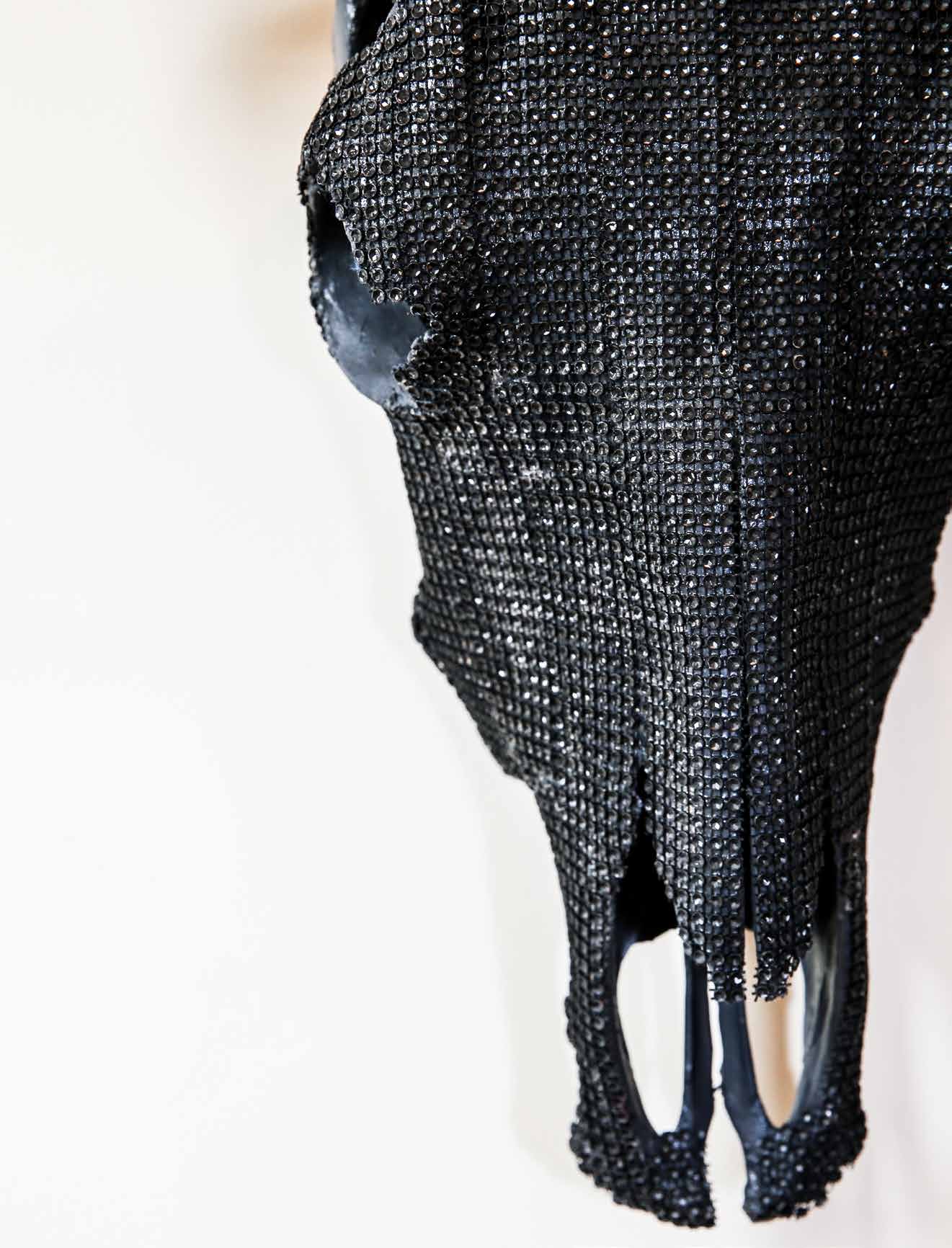 The materials used are natural and raw. Turquoise, quartz, and other various stones are from the mountains of Idaho, Utah, Wyoming and Montana. Swarovski crystals and bridal lace are often used to soften the inherent harshness of the skull.