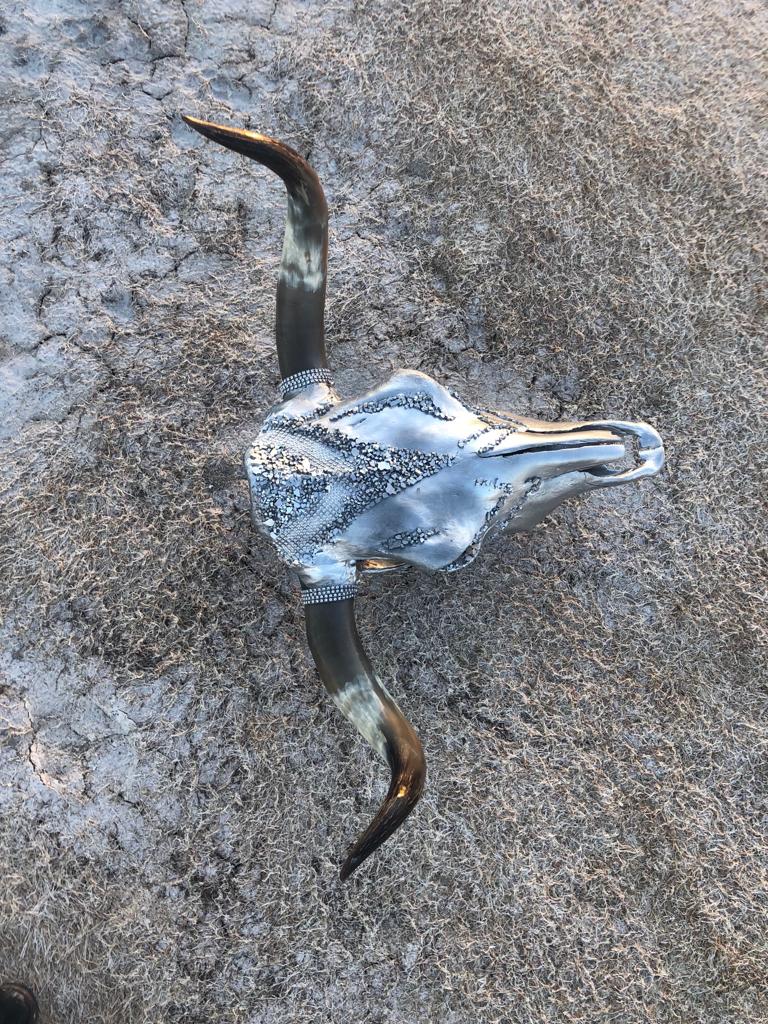 This piece has lace and crystal is finished with silver acrylic and a matte coating. Add description: Longhorn - reattached all the horns and polished with glass, horns span up to 6 feet, depending on piece.