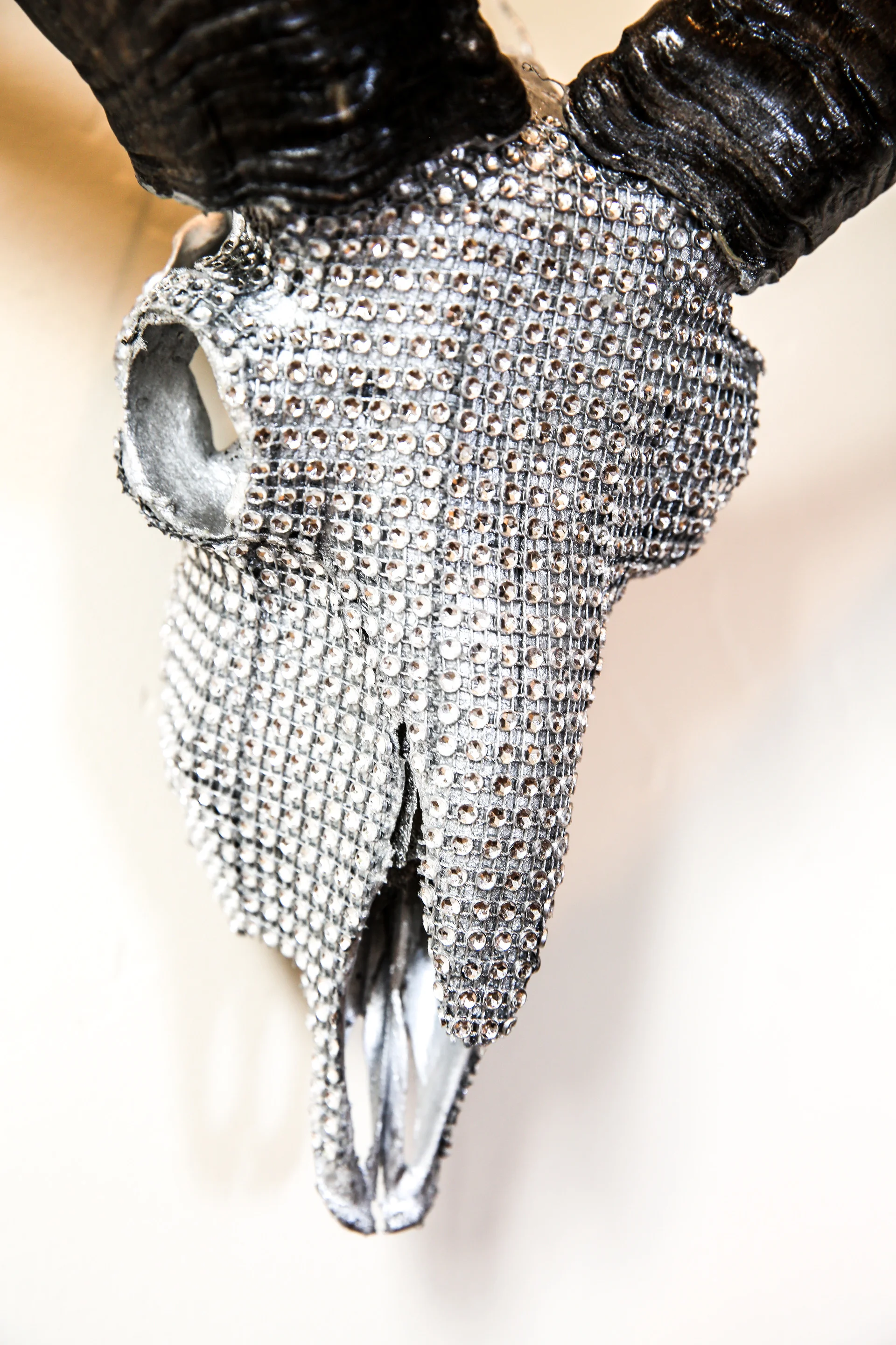 This wild goat has removable horn caps. The caps can be used for decorating the home separately. This piece is inlayed with bridal lace and Swarovski crystals and sealed in gold acrylic and a protective coating.